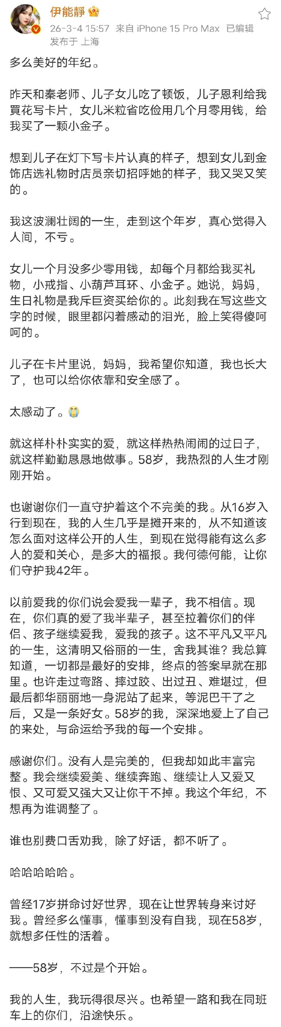 不老女神伊能静也50岁了,3月4日,伊能静发长文庆祝自己58岁的生日,还附上了一家四口庆生的全家福,女儿米粒,儿子恩利,还有老公秦昊都陪在身边,年轻时候被家境贫困又被重男轻女的伊能静也是苦尽甘来了。